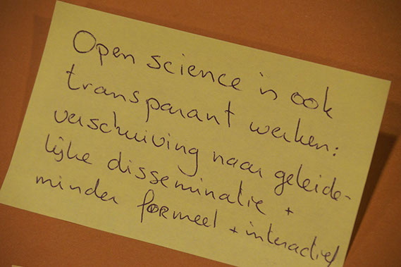 Waar is open science goed voor? Waarom moet OS 'gebeuren'? We vroegen het de deelnemers. Klik op de foto's voor de categorieën waarin hun antwoorden vielen.